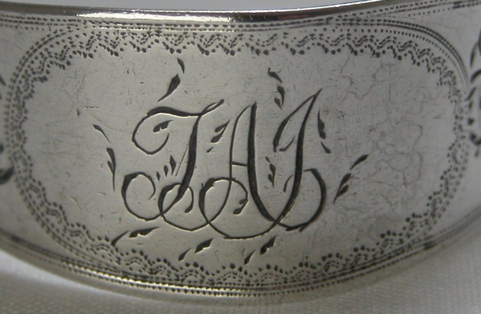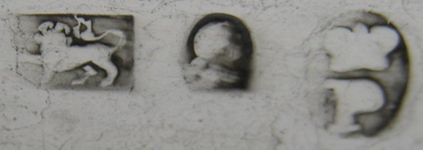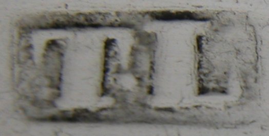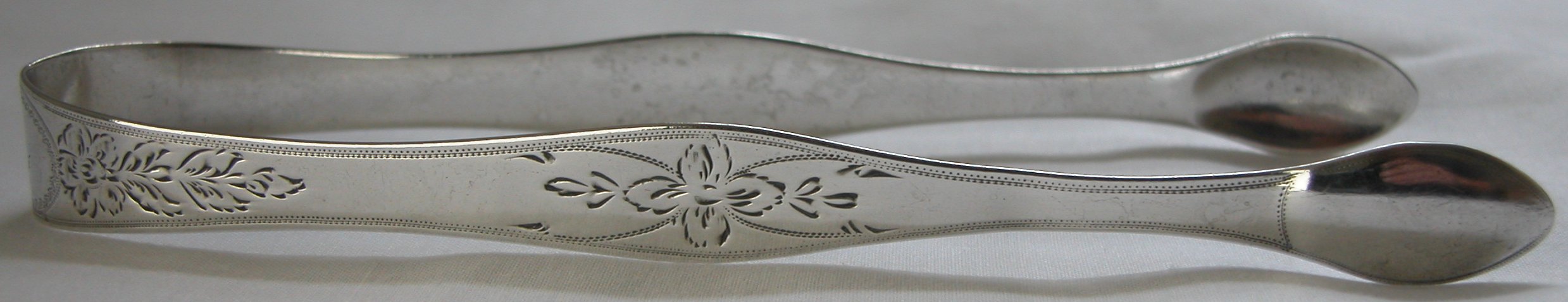 This pair of tongs is a pair of flared bright cut tongs. They are interesting in that the maker's mark is larger than others and has a pellet. They are dated 1808.