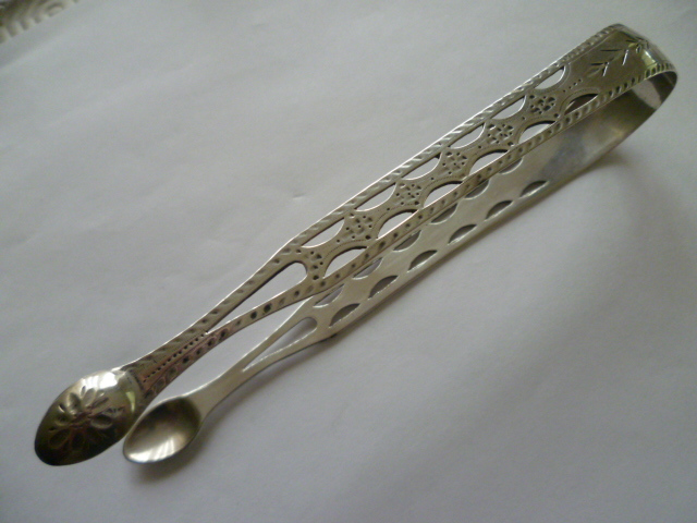 John Younge and Co. registered their mark on April 5th 1779. There were four different marks registered. IYCo in an oval cartouche, YG&H in an oval upside down triangle, IY in a simple rectangular cartouche and the mark on these tongs YG&H in an rectangular cartouche. Their names were actually John Trevers Younge, Edmund Greaves and William Hoyland. This is a superb pair of early tongs by John Younge & Co. They are of typical Sheffield early style with some very light bright cut engraving on pierced arms. They are dated 1785/86 and they have the incuse duty mark. These pictures are supplied by kind permission of Robert Gutsell. Click on any picture to enlarge |