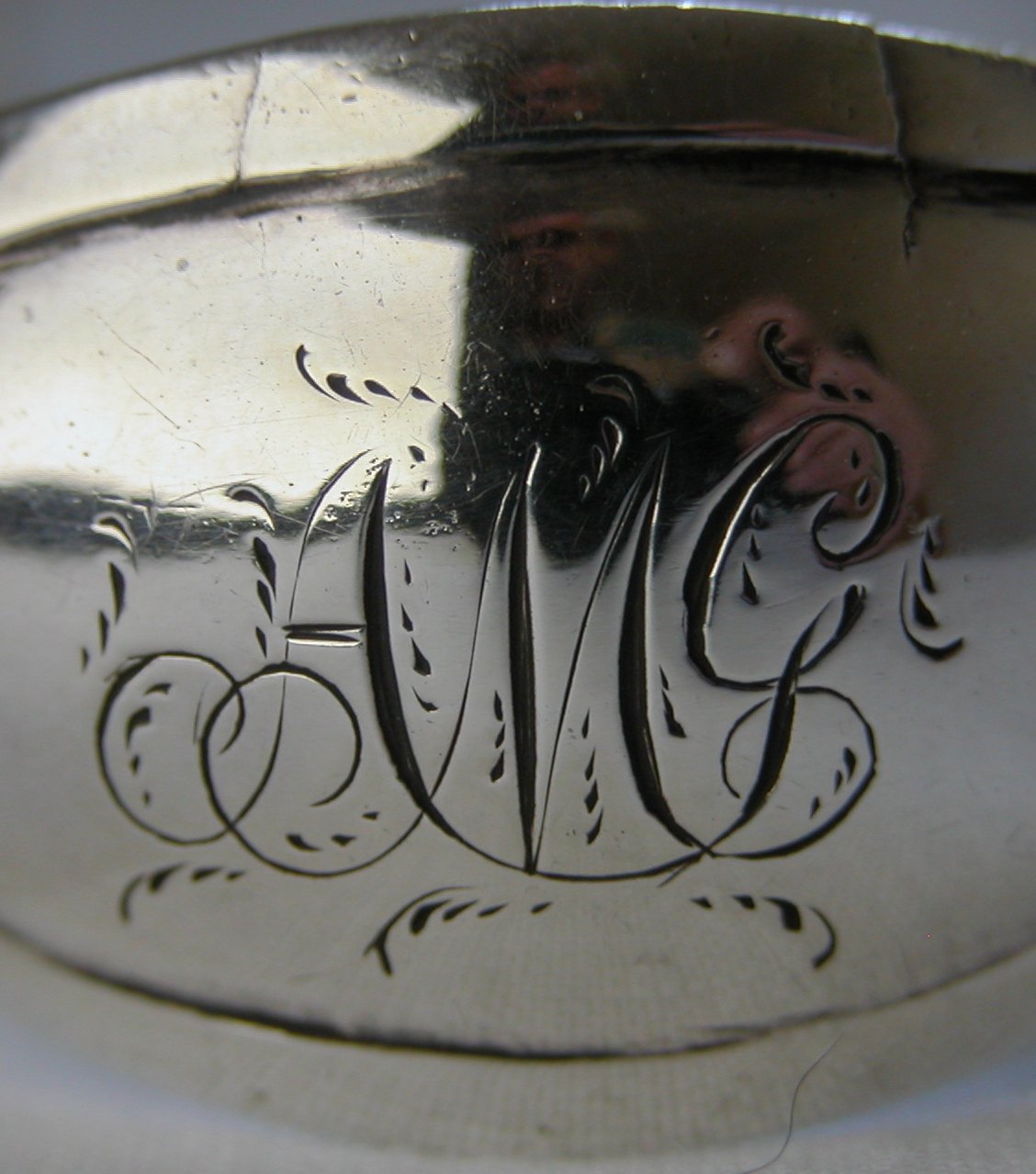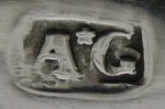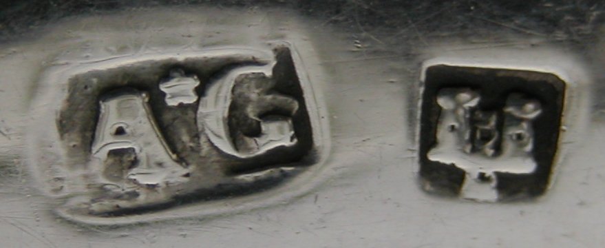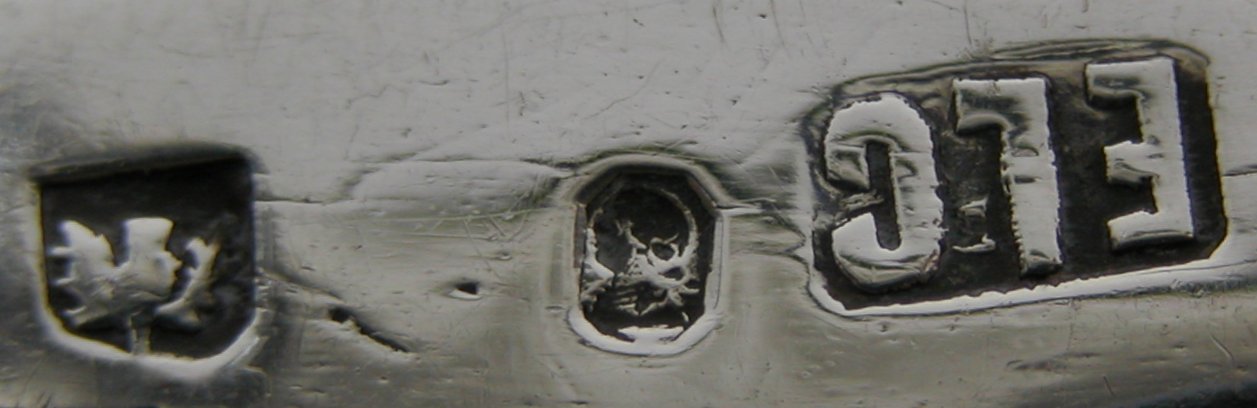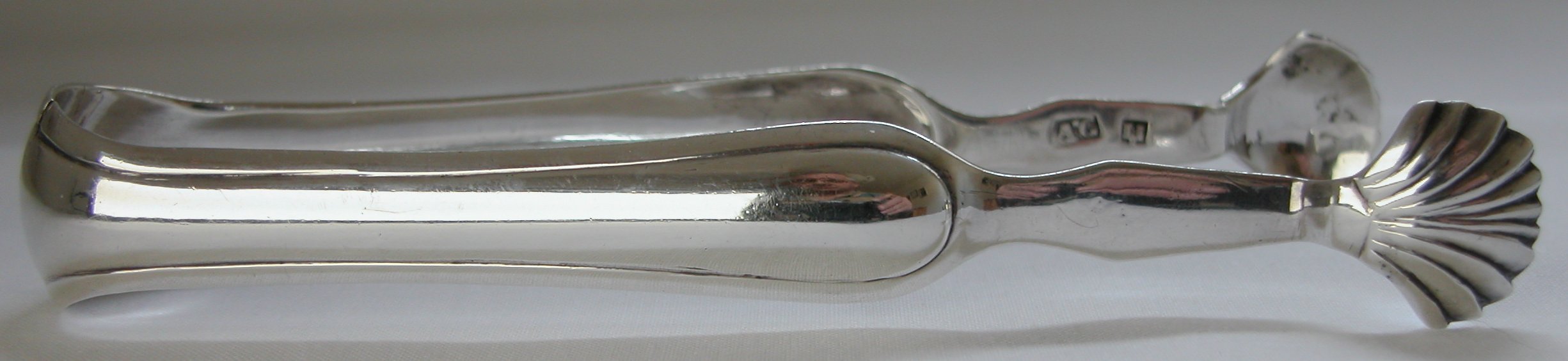 These are a beautiful; pair of tongs. They are in standard Scottish curved fiddle pattern style with scallop bowls. They are marked with the maker's mark "AG" for Alexander Gairdner but are also marked "ELG", for "E.L. Gairdner" as a retailer. They have the incuse duty mark, clearly dating them for 1785. They have a lovely inscription carved around the inside of the arms: "In remembrance of my mother I give you these tongs Augneys Steedman to Ingo Steedman"