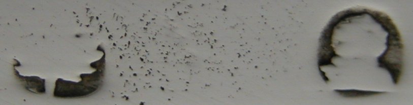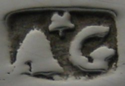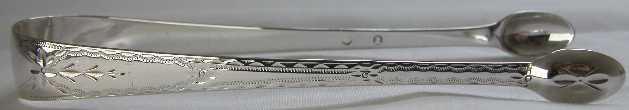This pair of tongs is fascinating. The town mark is very indistinct and may or may not be a thistle. Also the maker’s mark has a star pellet between the two letters. This mark is not shown in any reference book. Potentially these tongs may not be by Alexander Gairdner at all or indeed even made in Edinburgh! Again I have dated them as c1790. This pair of tongs does not have a concave bow. Click on any picture to enlarge |