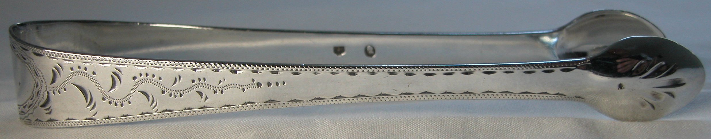 This pair of tongs is bright cut and is quite remarkable for their weight, weighing a massive 60 grams, twice as much as a normal pair of tongs. They have a beautiful bright cut engrave pattern and are marked with the thistle and duty mark on one arm and the maker’s mark on the other and are dated c1795.