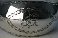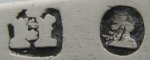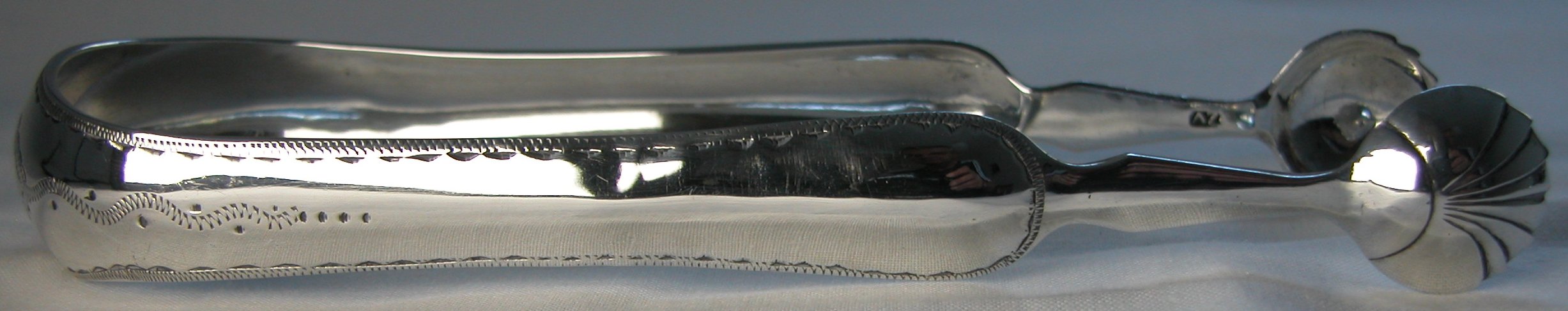 These are a lovely pair of sugar tongs. They are of absolutely typical Scottish style, being concave fiddle pattern and with the circular shell type bowls. They have a light bright cut engraved feather edge with a pattern to the top of the arms. It is quite unusual to see bright cut engraving on this style of tongs. This pair of tongs is marked with the three castles, duty mark and maker’s mark, again with the maker’s mark on one arm and the hallmarks on the other, being the castle rather than the thistle. They are dated c1790.