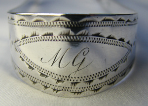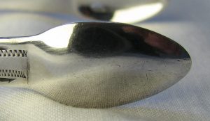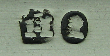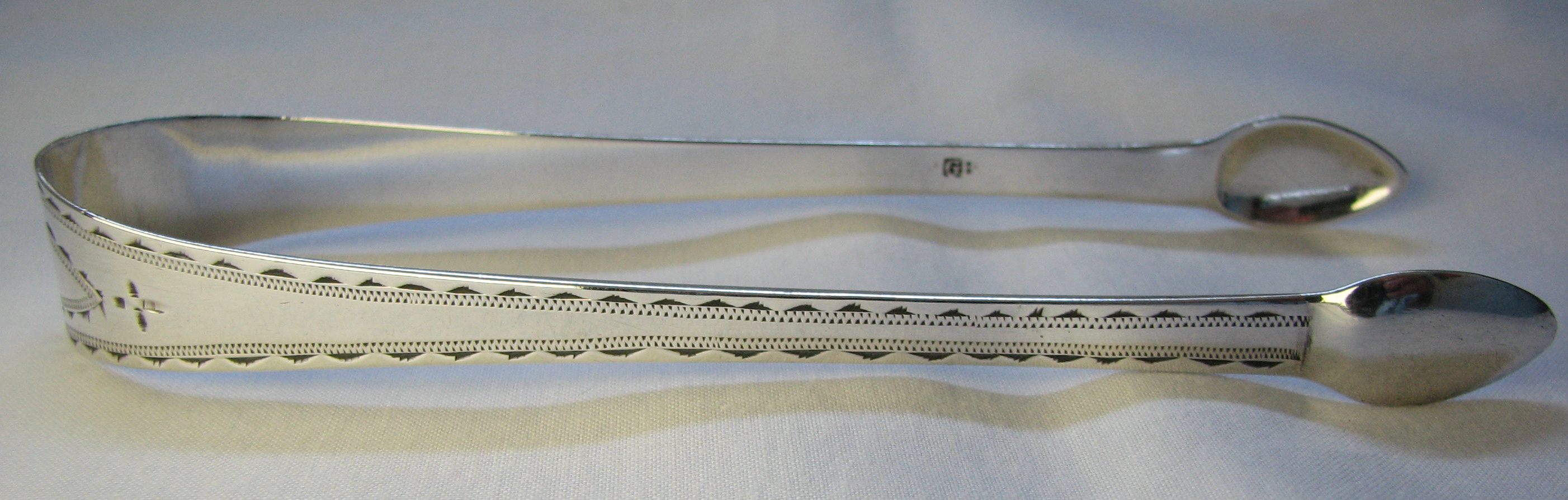 This pair of tongs is interesting in that they are bright cut engraved in the standard London style. If it were not for their size and the Edinburgh hallmarks they could be mistaken for any pair of London bright cut engraved tongs. They are nearly 6 inches long and weigh 41 grams. These tongs have the castle and duty mark on one arm and the maker's mark on the other. The tongs have been hallmarked in Edinburgh and are probably dated some time in the 1790's. George Beech is recorded as registering a mark in Edinburgh in 1770. Many thanks to Robert Wilson for help with re-attributing these tongs. I had previously shown them as George Booth of Aberdeen which is clearly wrong. Click on any picture to enlarge |