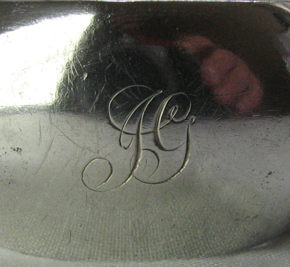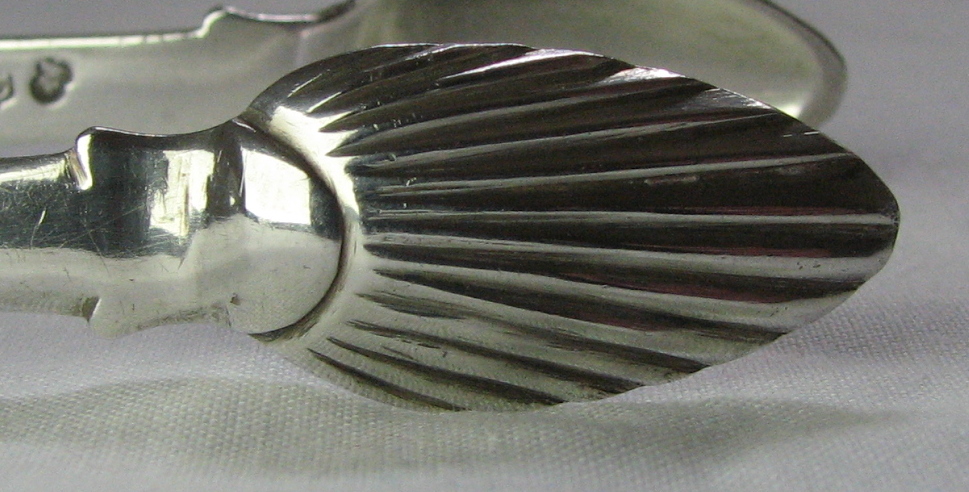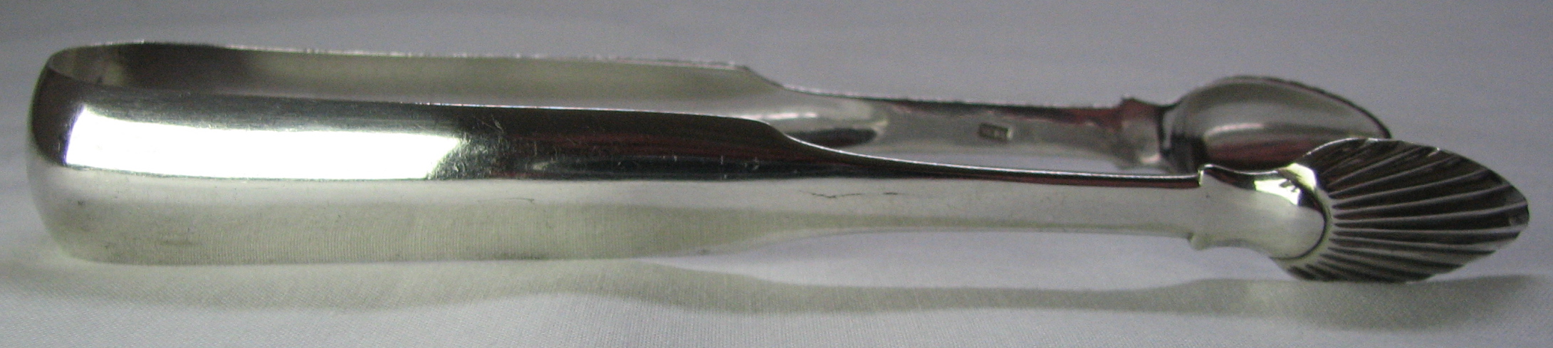 These tongs are one of an identical pair, monogrammed "IG".  They are hallmarked Edinburgh 1810. They are fairly standard Scottish style tongs, fiddle pattern and concave with pointed shell bowls.