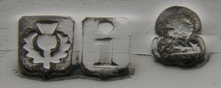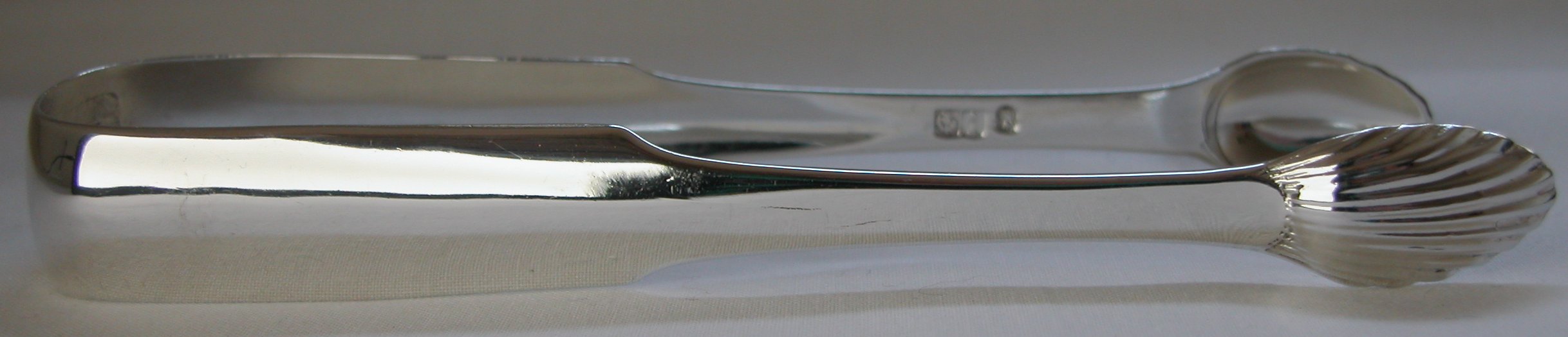 These tongs are fairly standard Scottish style tongs with shell bowls. The maker's mark is now different to the earlier dated mark.