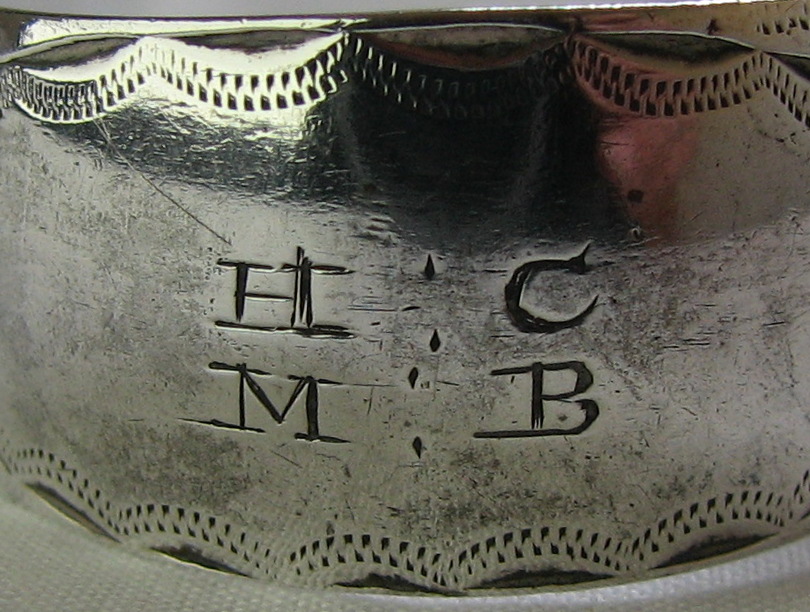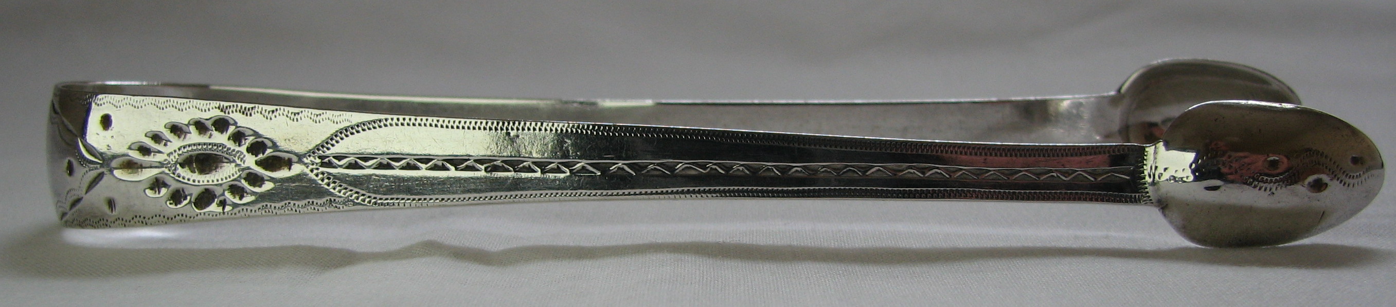 These are straight sided bright cut tongs. The general style of these tongs is very similar to the others by Francis Parsons. This pair has a monogram of two sets of initials.