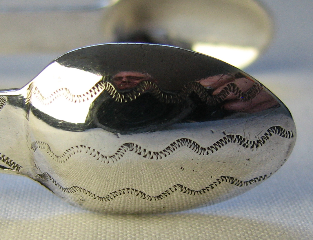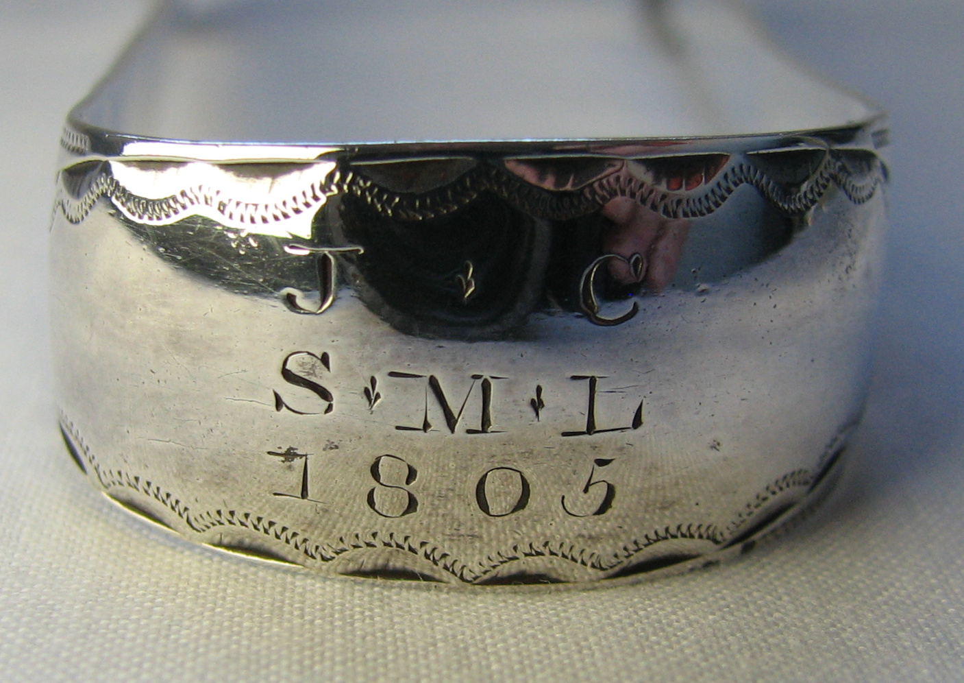 These are very unusual in that they are bright cut engraved. They are the only pair of bright cut engraved tongs I have ever seen by Parsons & Goss. The hallmark shows the duty mark as clipped and they have a very helfpful monogram that dates them at 1805. Click on any picture to enlarge |