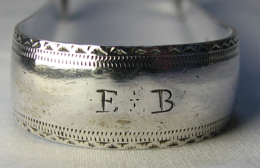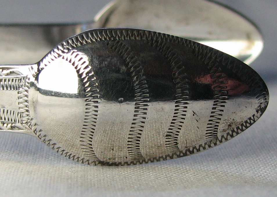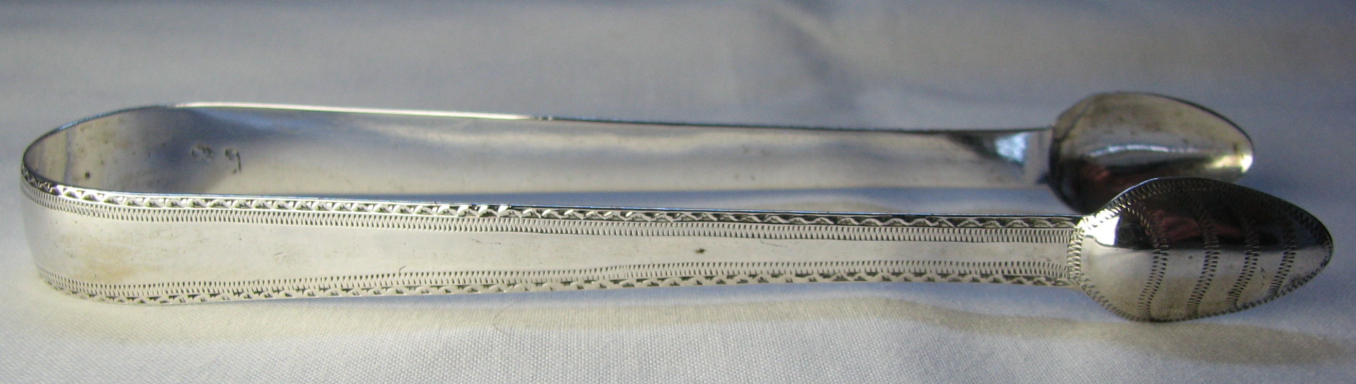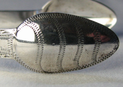 This a pair of fairly standard bright cut engraved tongs. There is an interesting pattern to the bowls, but otherwise no distinguishing features. I have dated these tongs between 22nd December 1797 and 7th August 1798. This is because the Lion is of the earlier style, which I sometimes think of as looking more like a mouse than a lion. This lion is often referred to as the "Letterbox Lion" - with good reason I think! Click on any picture to enlarge |