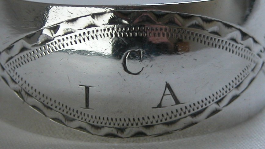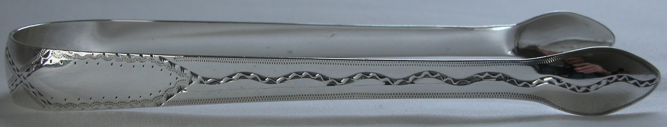 These tongs are bright cut and straight edged. They have a lovely snaking pattern down the lower half of the arms and through the bowls. Again the styling and quality is good. I have dated them as 1794/95 but from their style they may well be one of the earlier pairs, i.e. 1783/84. Click on any picture to enlarge |
