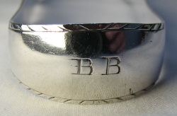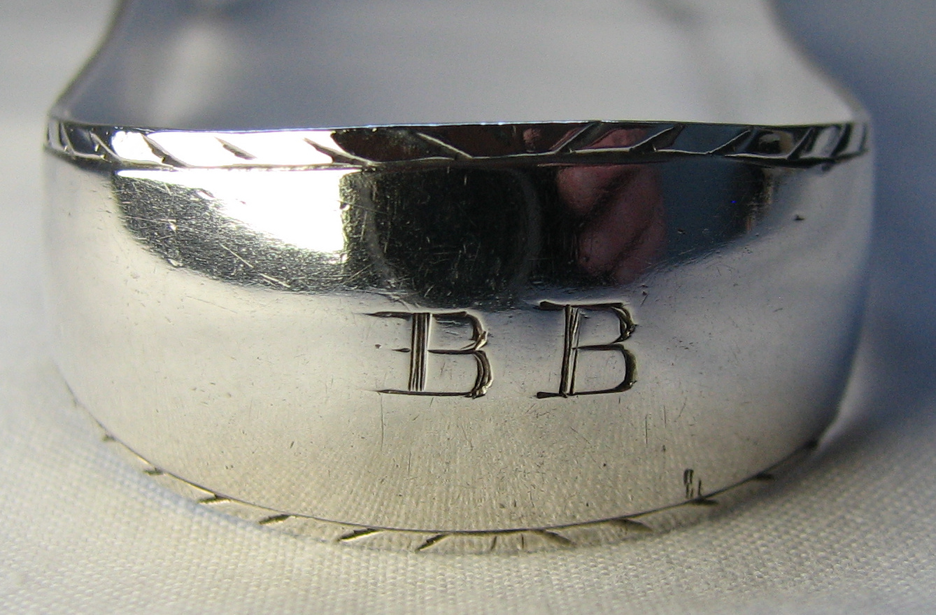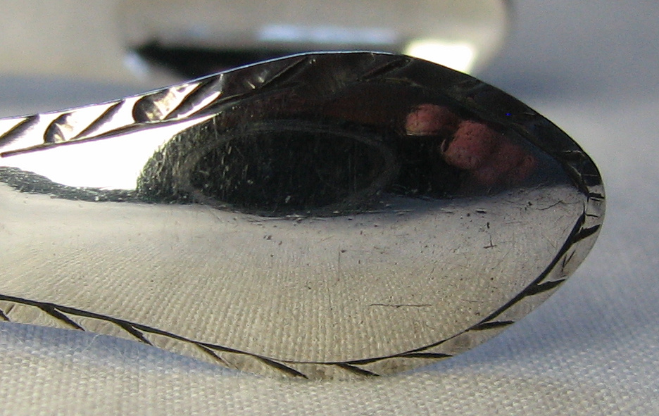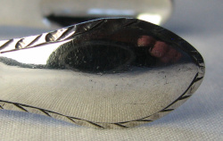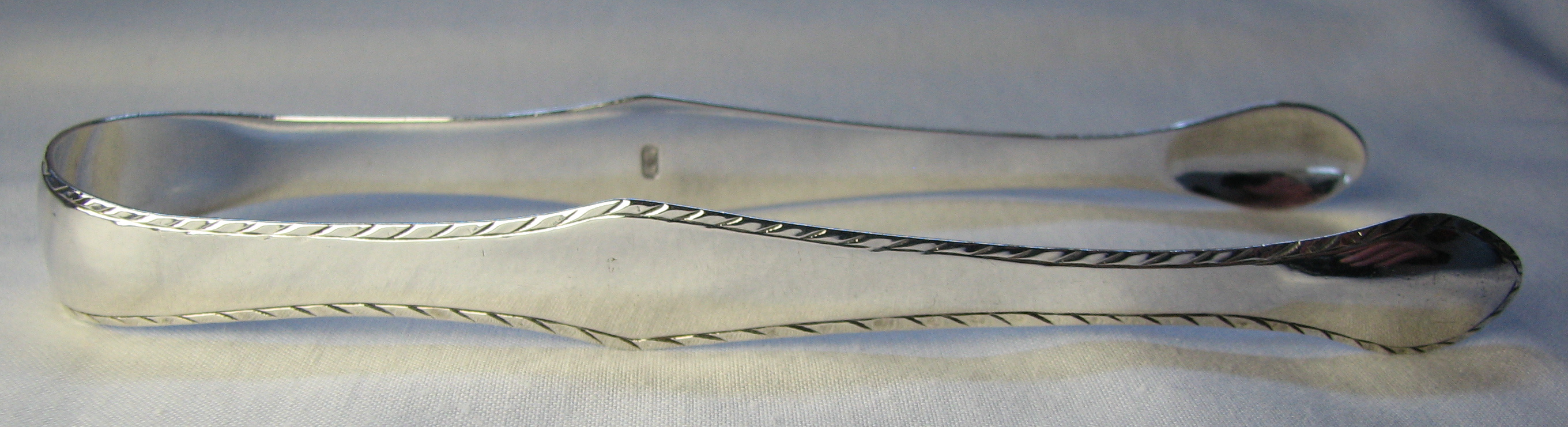 These tongs are flared and bright cut with feather edging extending around the bowls. I have dated them as 1794/95.