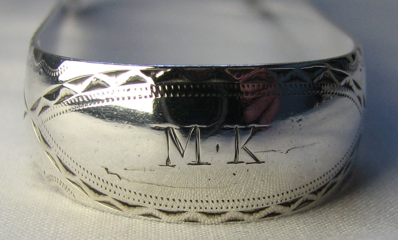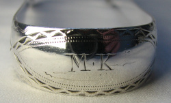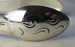 These tongs are bright cut and straight edged with oval bowls with an interesting bright cut pattern to them. Notice that the assay office were not very careful about where they punched the lion and the duty mark! I have dated them as 1794/95. Click on any picture to enlarge |