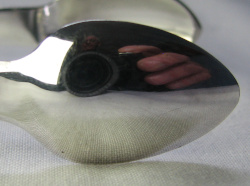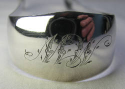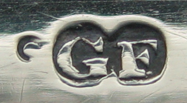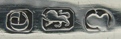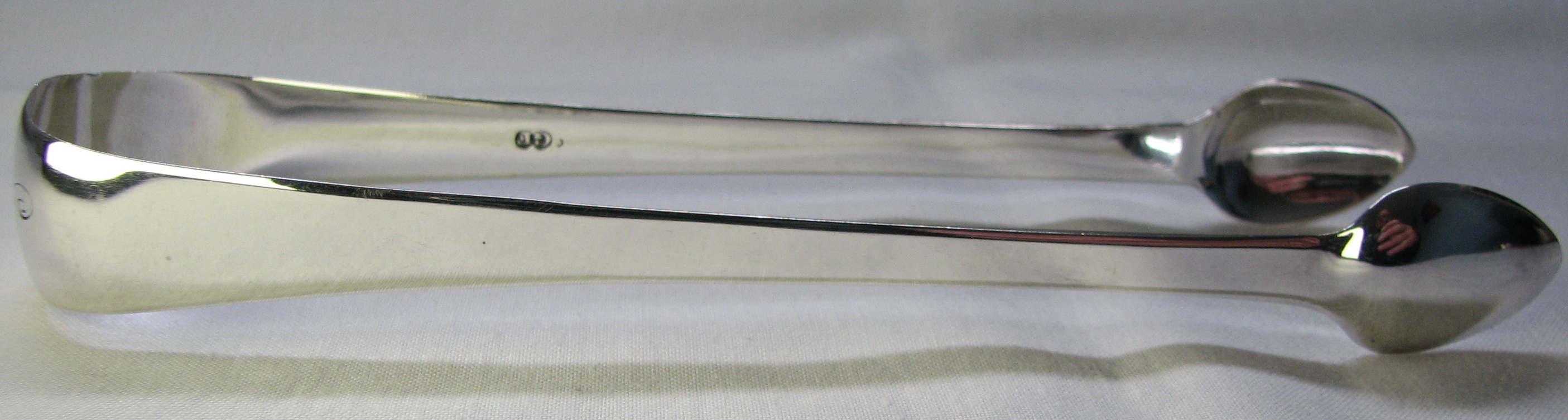 These are a pair of completely plain sugar tongs with a wide bow. The tongs have what looks like a half moon as a journeyman's mark and it also appears as if the maker's mark has been updated. This one being slightly different to the previous ones. They are dated 1821/22. Click on any picture to enlarge |