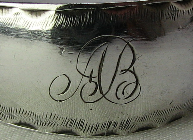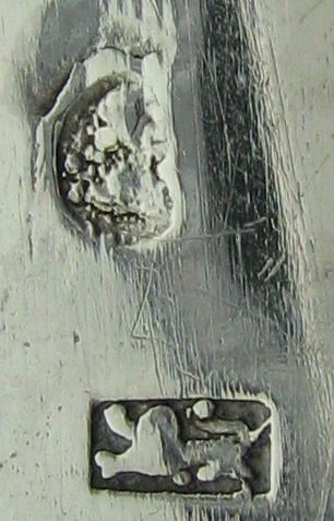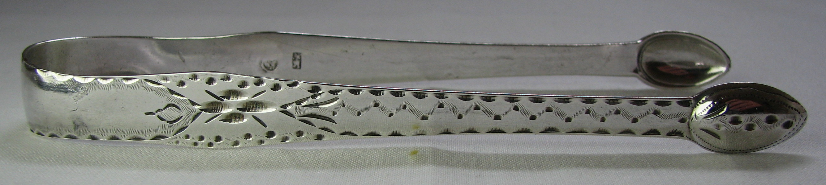 This pair of tongs are flared with bright cut engraving over the whole. They are particularly interesting in that they appear to have the unusual profiled duty mark, whereby the right hand side of the duty mark has been removed. It is believed that this may have been done to indicate the increase in duty in 1797. I have therefore tentatively dated them at c1797. Click on any picture to enlarge |