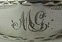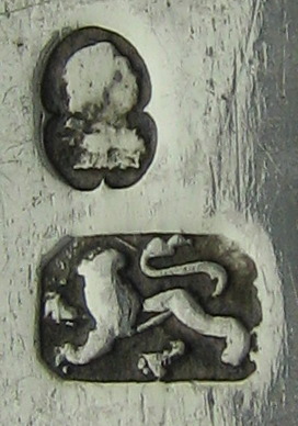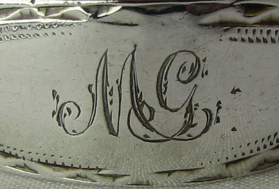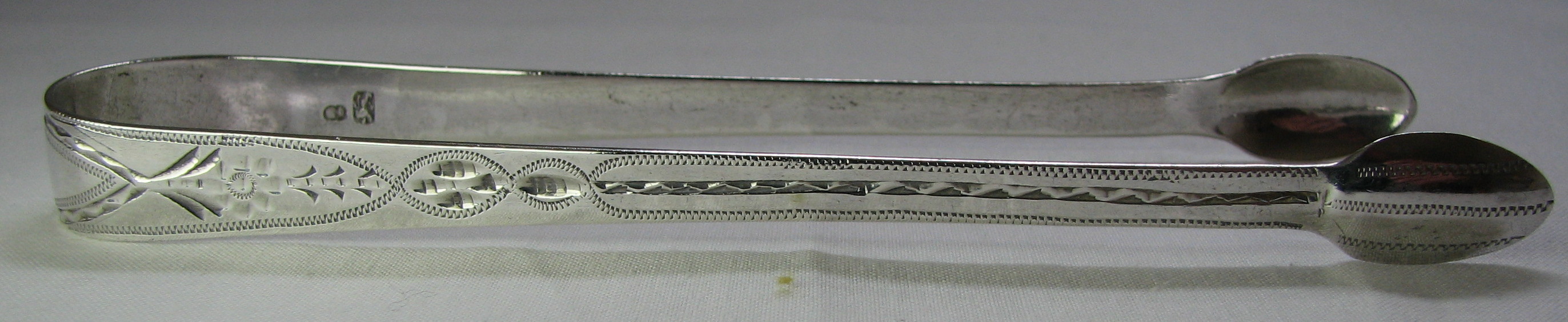 This pair of tongs are straight with bright cut engraving over the whole. They have an elaborately engraved monogram "MG". From the combination of Lion Passant & Duty mark, I have dated them c1800.