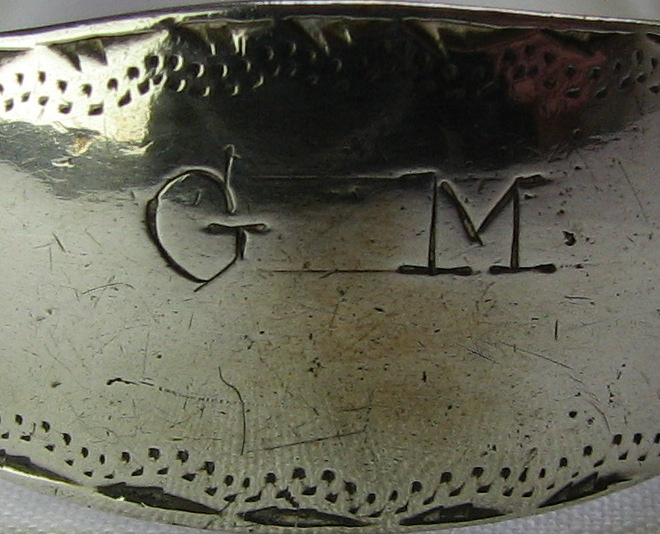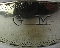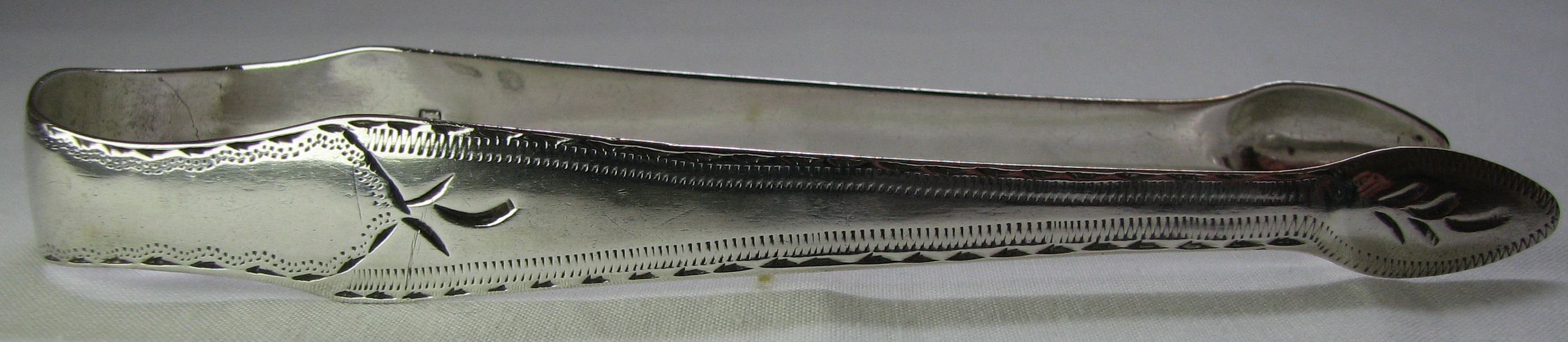 This pair of tongs are flared with bright cut engraving over the whole. In overall style they look very similar to George Burrows of London tongs. From the combination of Lion Passant & Duty mark I have dated them at c1806. Click on any picture to enlarge |