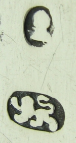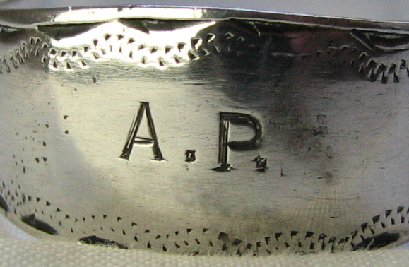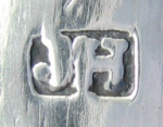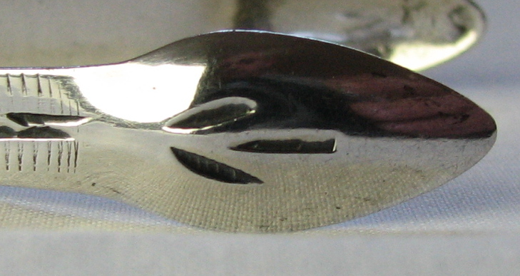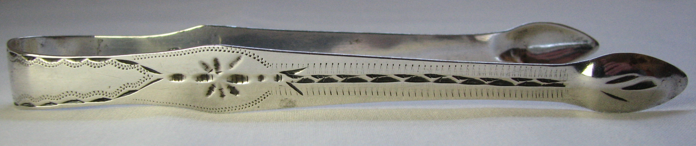 This pair of tongs are flared with bright cut engraving over the whole. The engraving is fairly crude as is quite common with these early Exeter makers. They are noticeably very similar to many Richard Ferris tongs. From the combination of Lion Passant & Duty mark I have dated them at c1806. Click on any picture to enlarge |