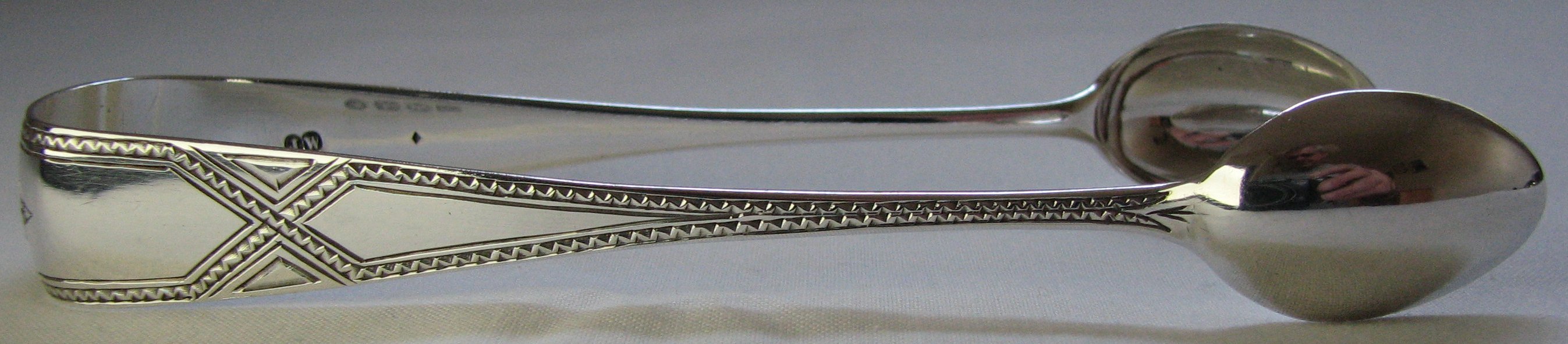 Josiah Williams & Co. is recorded as a Bristol silver-smith dating between 1874 and 1883. These tongs are dated 1878 and are a delightful pair of tongs with a lovely clear engraved pattern. They are sharply tapered and have a nice engraved cartouche for the monogram. Click on any picture to enlarge |