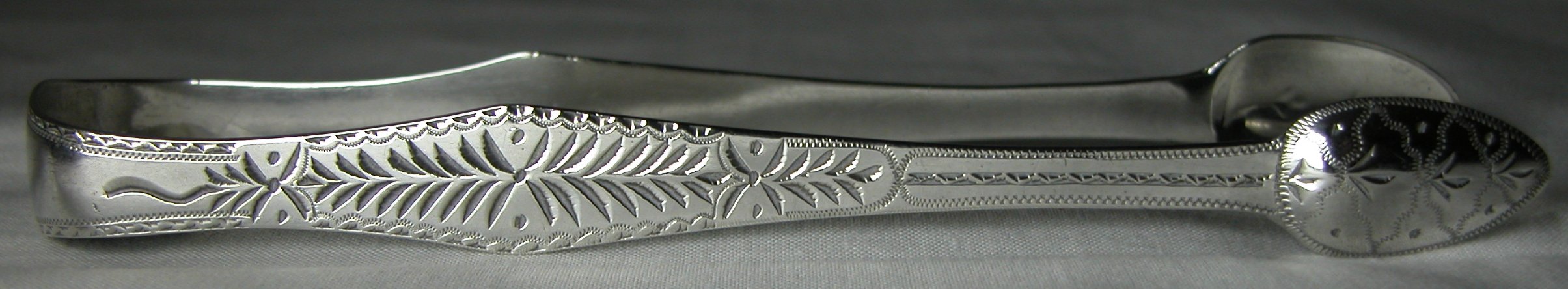 This is a pair of flared bright cut tongs, in the standard style for Richard Ferris, dated c1811. These tongs have the date letter and lovely sharp bright cut engraving.