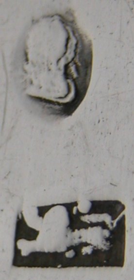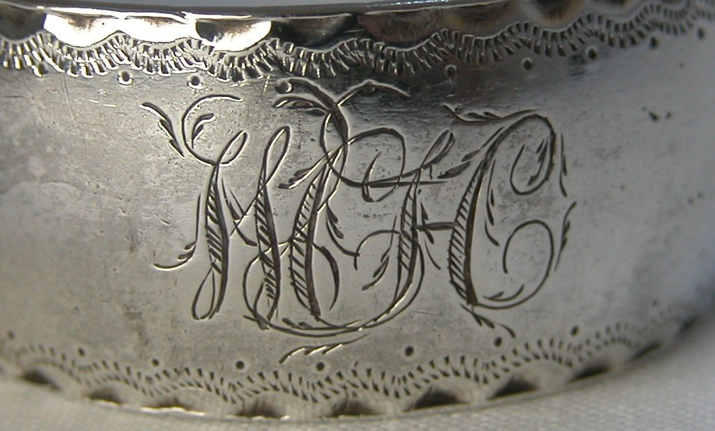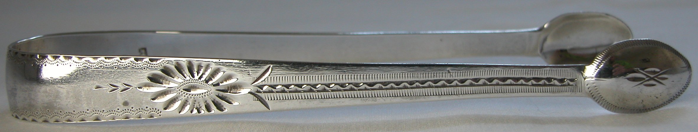This is a pair of straight edged bright cut tongs. They have a lovely "sunburst" motif at the tops of the arms and an elaborate engraved monogram. From the shape of the Lion & Duty mark, I have dated them at c1790.