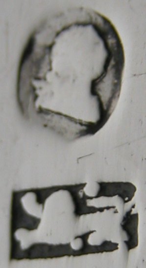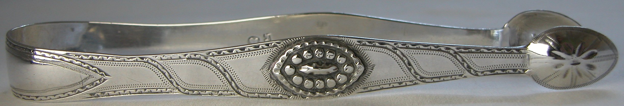 the shape of the Lion & Duty mark, I have dated them at c1790. Click here to see embossed tongs by Francis Parsons & Stephen Crees Click on any picture to enlarge |