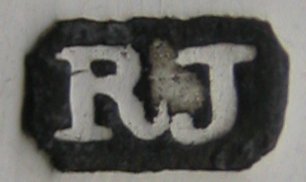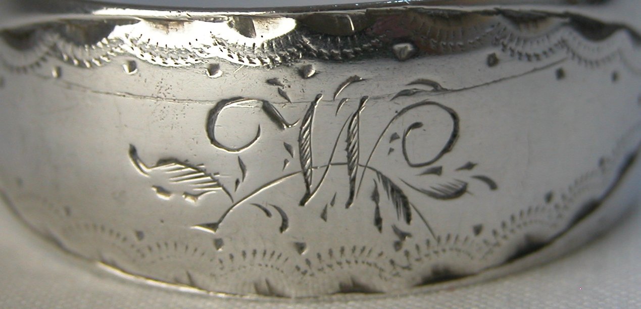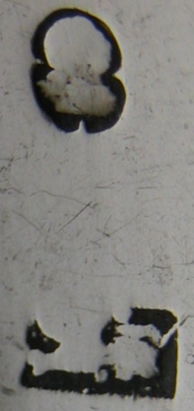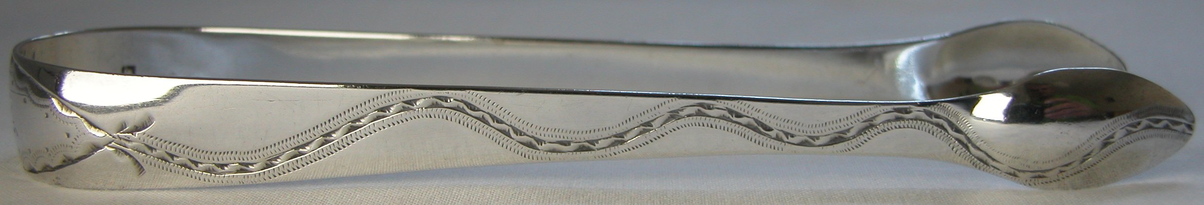 This is another gorgeous pair of sugar tongs. They have a fascinating snaking pattern that extends right through to the bowls. They are blessed with an elaborate engraved monogram "W". From the shape of the Lion & Duty mark, I have dated them at c1797, slightly later that the others because of the clipped duty mark. These tongs have the rarer maker's mark, in the rectangular punch with cut corners. Click on any picture to enlarge |