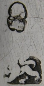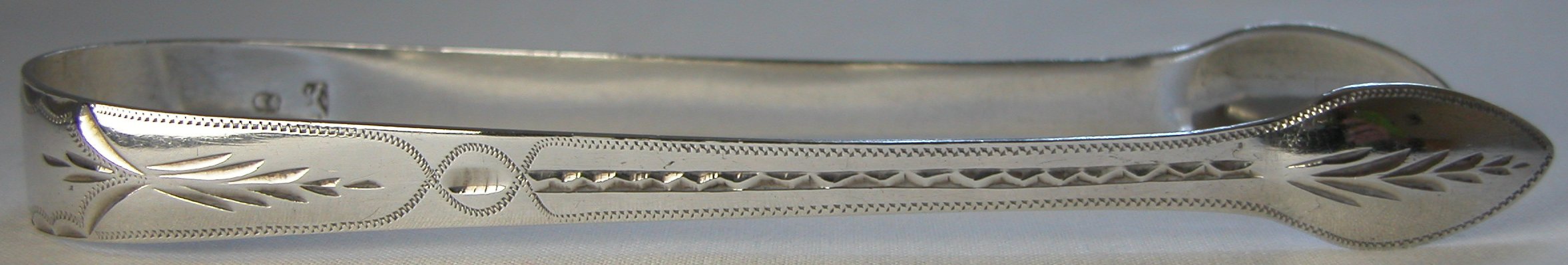 This is a pair of straight edge bright cut tongs with quite pointed bowls. The maker's mark has reverted to the more normal rectangular punch. From the shape of the Lion & Duty mark, I have dated them at c1800, because the shape of the Lion Passant has now changed. Click on any picture to enlarge |