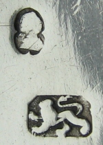 This is a pair of straight edge bright cut tongs with quite pointed bowls. The maker's mark has reverted to the more normal rectangular punch. From the shape of the Lion & Duty mark, I have dated them at c1800, because the shape of the Lion Passant has now changed. These tongs have a monogram that looks like "IB" and is probably contemporary. Click on any picture to enlarge |