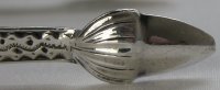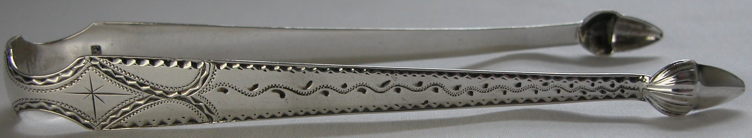 This pair of tongs is magnificent. They have lovely sharp bright cut engraving and a unique style, with cut in shoulders and beautifully shaped acorn bowls. They have no monogram and are marked with just the lion passant and maker’s mark, dating them some time before 1784. Click on any picture to enlarge |