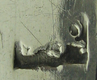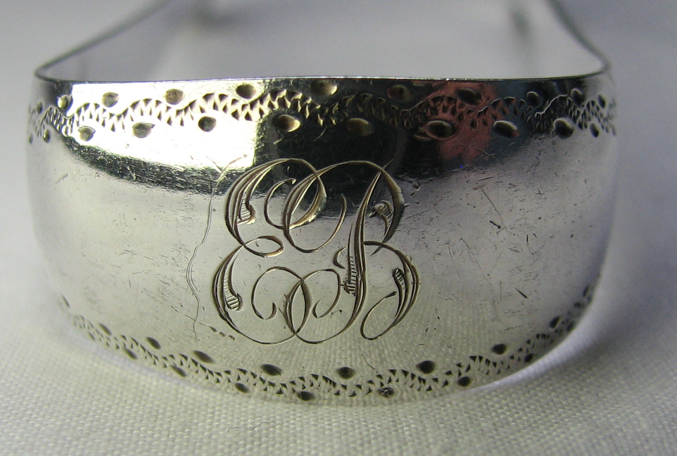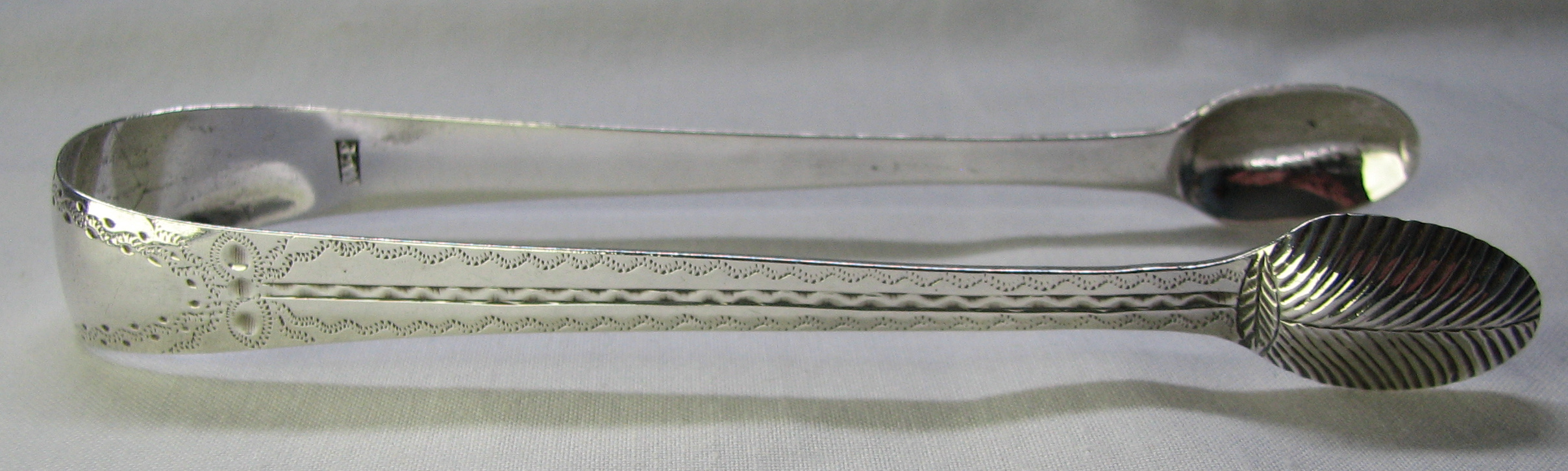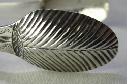 This is a fascinating pair of tongs. They are shorter than most tongs, being just less than 5 inches long. There is no sign of them having been shortened, they appear to have been made this length. Despite thier length they have large and heavily engraved bowls. They are marked with the makers mark and Lion only, dating them to 1784 or before. Click on any picture to enlarge |