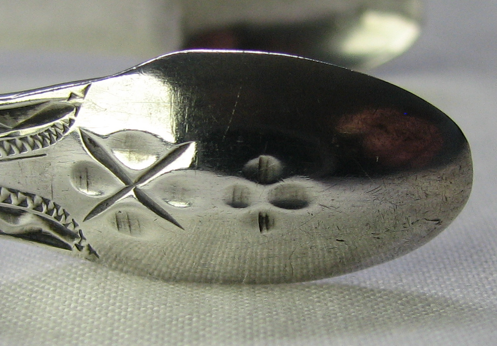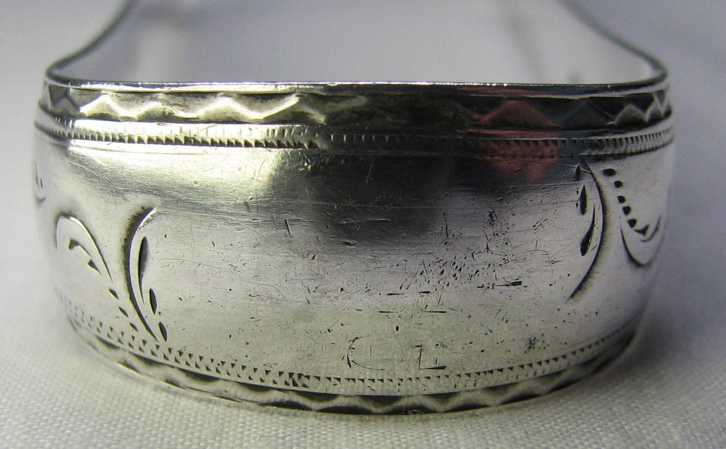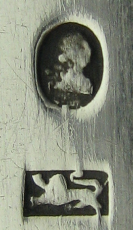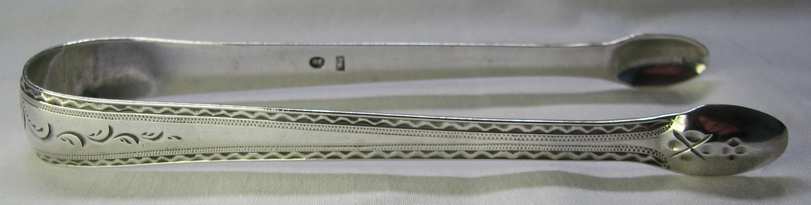 This is a pair of straight sided and bright cut engraved tongs. There is nothing remarkable about them except the maker's mark is quite different to others. From the hallmark, I have dated them at around 1790.