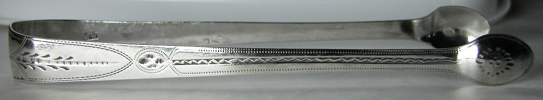 These tongs are a straight sided bright cut tongs. The shape of the duty mark suggests a date between October 1806 and 1810.