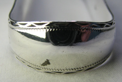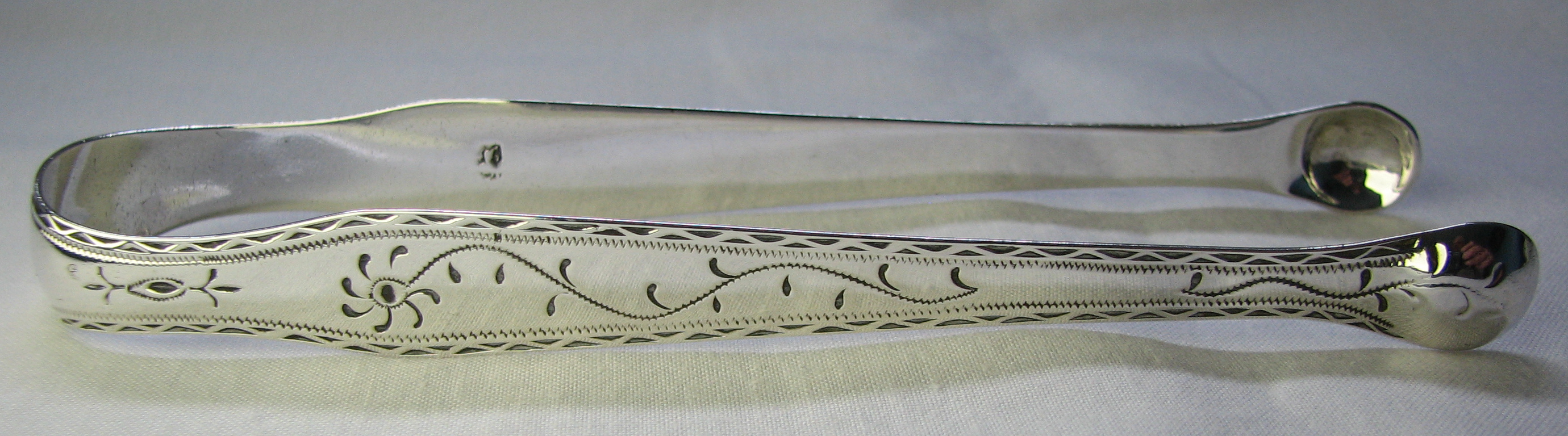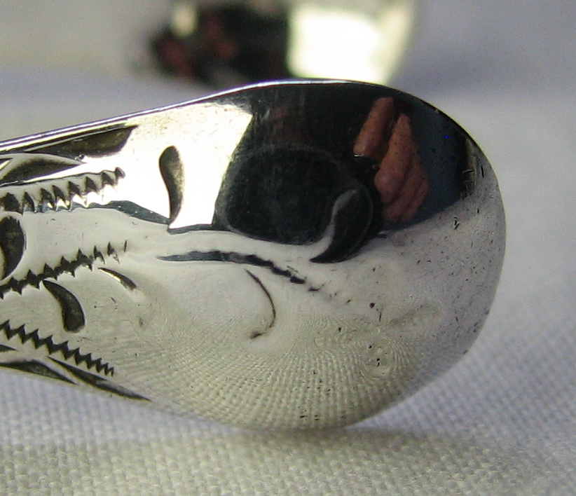 These are a lovely pair of tongs. The design marks them out as being early, as well as the fact they were made by William Welch of Plymouth Dock, who will have had these assayed in 1781/82. Notice how closely these resemble the other pair of tongs! Click on a picture to enlarge |