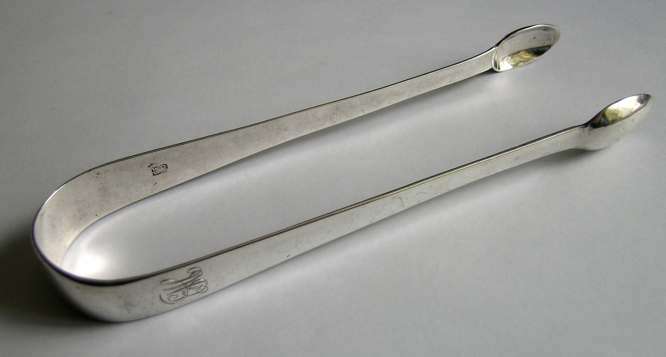 Tongs by William Welch II and William Parsons are very rarely seen, so this pair is a great pleasure to be able to publish. The maker's mark is a little indistinct as the original mark (probabaly Francis Parsons) is overstruck. Click on any picture to enlarge |