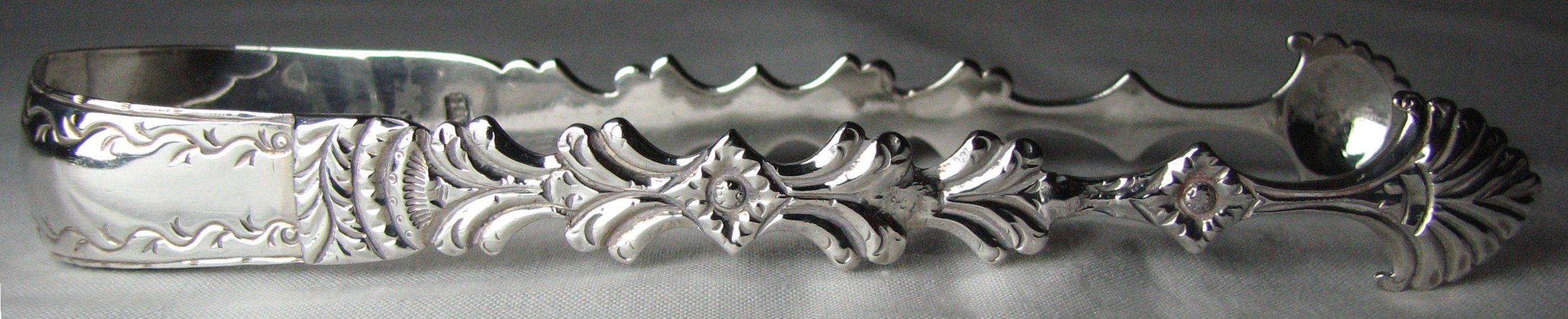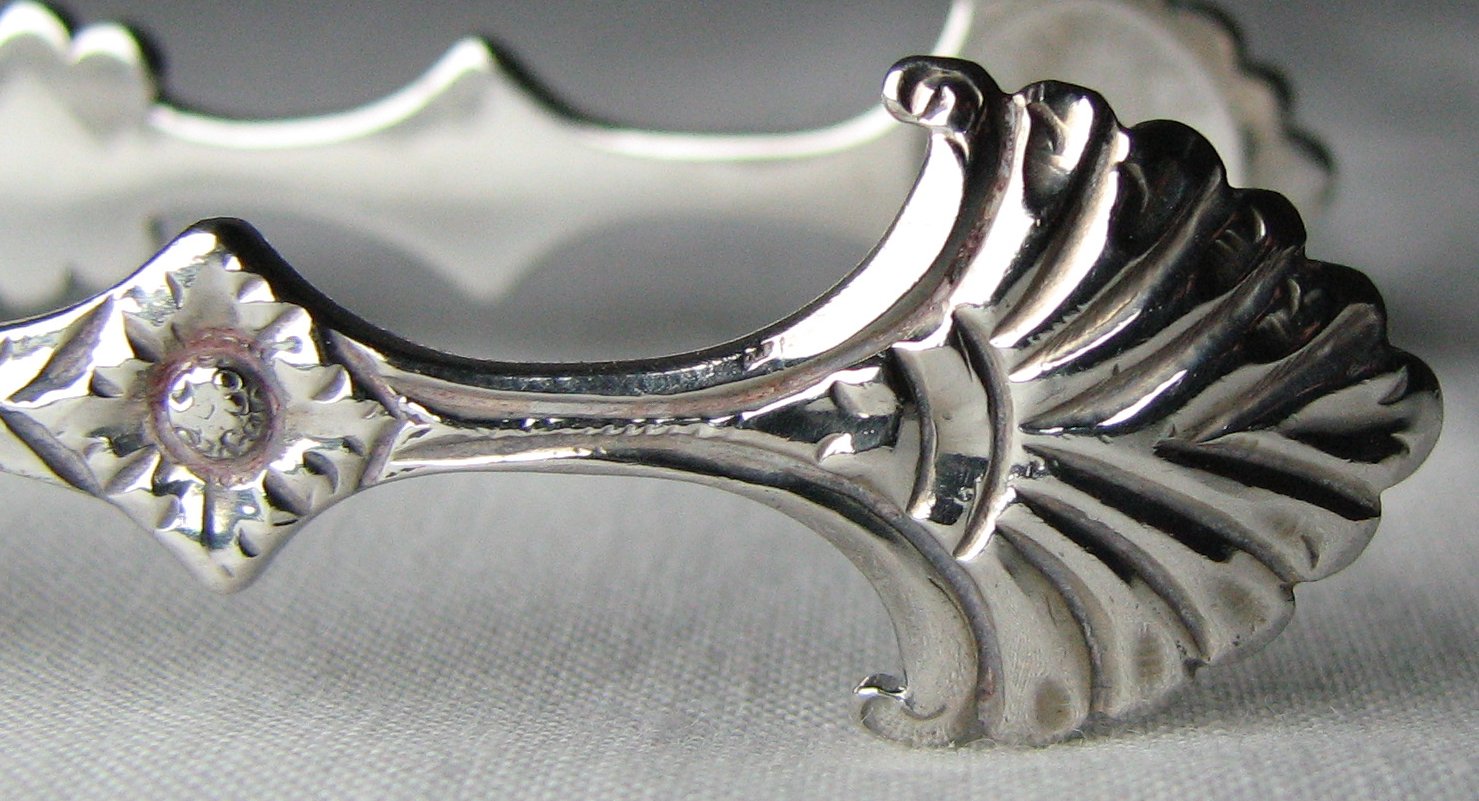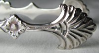 This is a rare maker of sugar tongs. There is no record of Alexander Barnet’s apprenticeship and he only registered one mark, as a small-worker on 8th August 1759. He does appear in the Parliamentary report of 1773, but without category. These tongs are lovely cast tongs with shell bowls with scrolls. The bow has a bright cut edge to it. They are probably dated c1770 – 1775. Click on any picture to enlarge |