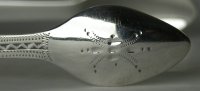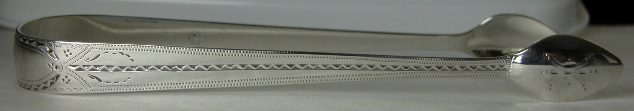 These are a fairly standard style pair of bright cut tongs, dated 1801/02.