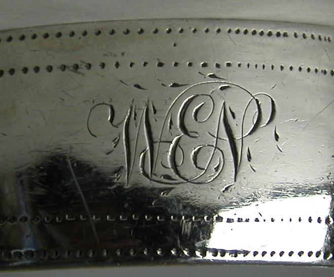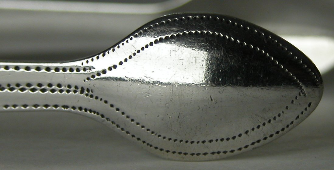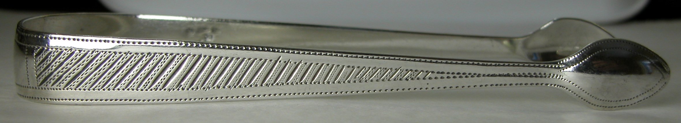 These tongs have a lovely interesting pattern on the arms. Almost as if they were machined. This is quite possible at this time, although it would be a little early for machined engraving work. They are dated 1802/03.