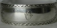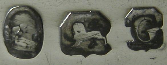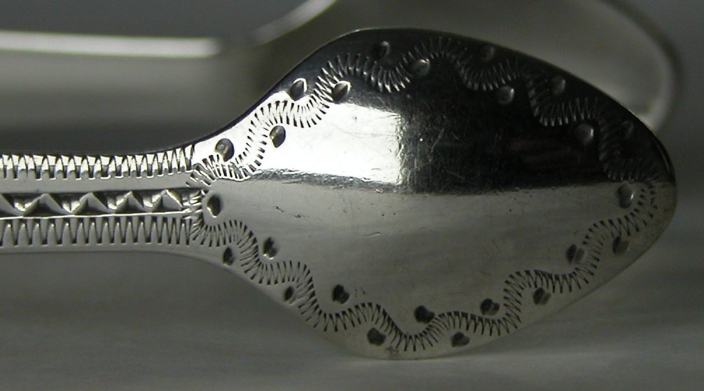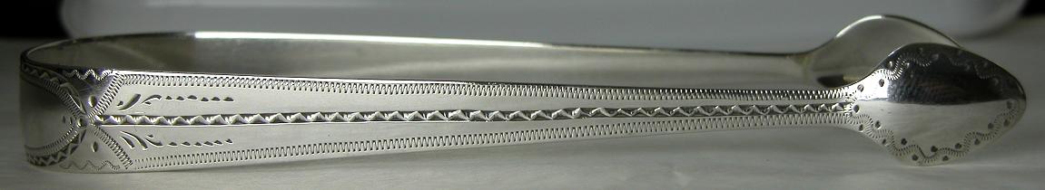 These tongs are a standard style for bright cut tongs of this period but they have a slightly abnormal shaped bowl - almost spade shaped. Although the maker's mark is very rubbed, it can still be identified as Alice & George Burrows. They are dated 1802/03. Click on any picture to enlarge |