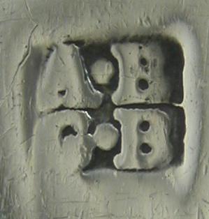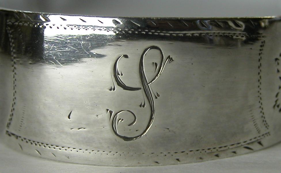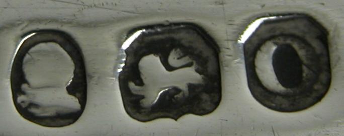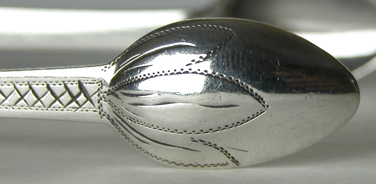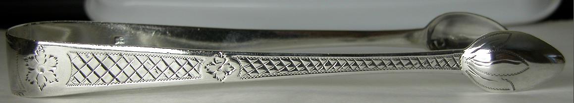 These are another unusual pair of bright cut tongs, dated 1809/10. Again, the pattern appears as if it has been machined. They have a very unusual flower petal pattern engraved on the bowls. This maker's mark is also smaller than the previous marks. Click on any picture to enlarge |