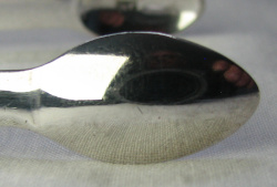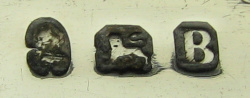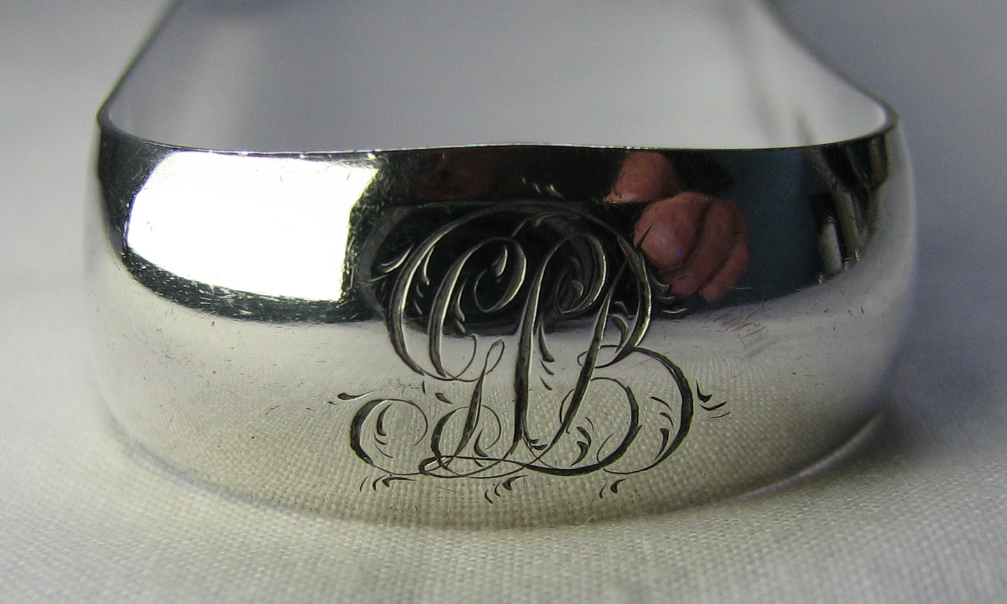 This is a fairly ordinary pair of "Old English" style sugar tongs. What is of particular interest is that the maker's mark has been struck in the bowl and the hallmark to the top of the arm. One normally sees both the hallmark and maker's marks either in the bowls or the arms, but not split like this. When one sees marks struck in the bowls they would normally be dated prior to 1791 (when the first date letter was used on sugar tongs). It would be quite difficult to strike duty mark, lion passant AND date letter in a bowl. For this reason after 29th May 1791 makers would normally strike their marks to the inside tops of the arms and the assay office strike the hallmark on the opposite arm. I find it odd that 6 years after this had become the norm Abraham Peterson chose to strike his mark in the bowl. Bear in mind that the maker's mark is struck BEFORE the assay office strike the hallmarks. The tongs are dated between 6th July 1797 and 28th May 1798. This can be determined because of the triple cusp duty mark, representing the increase in duty on 29th May 1797. Click on any picture to enlarge |