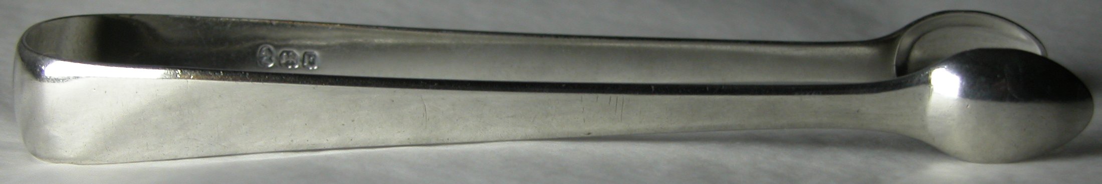 This pair of silver sugar tongs is very interesting in that they have been over-struck. The previous maker is difficult to distinguish but looks like it is Eley & Fearn. The tongs are dated 1801/02