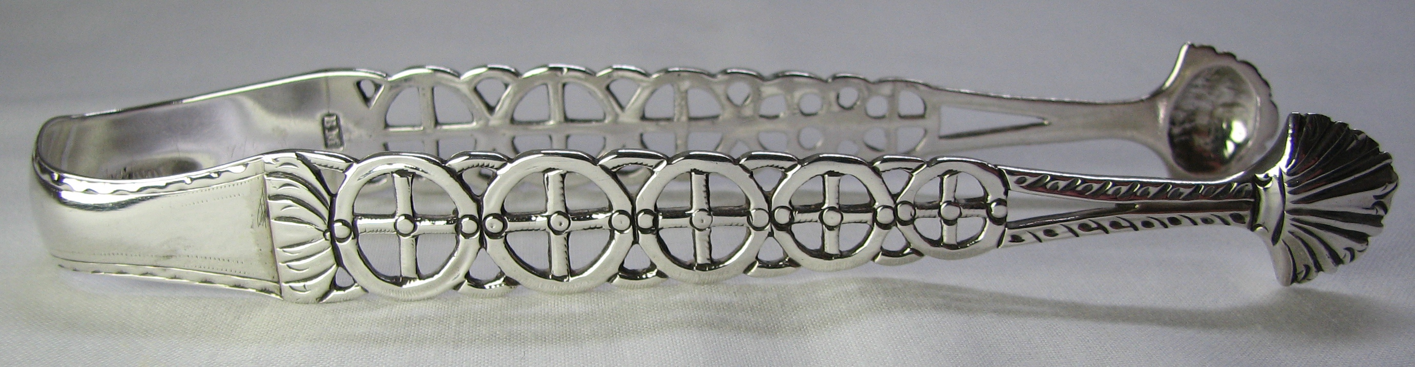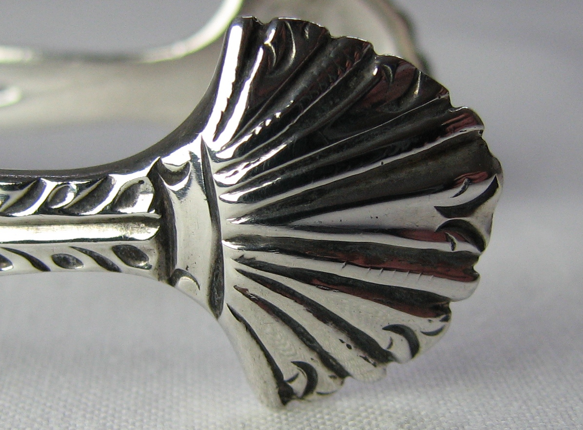 These tongs are a lovely pair of cast tongs, with circular pattern and shell style bowls. They are dated c1770 - 75