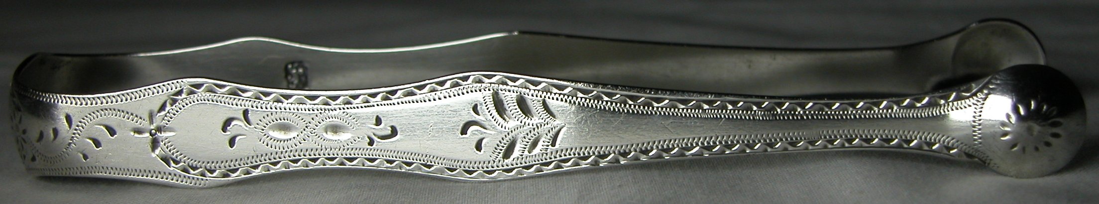 These tongs are bright cut with a double flared pattern and circular bowls. They are dated c1780