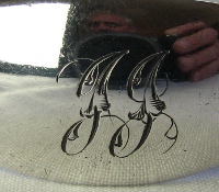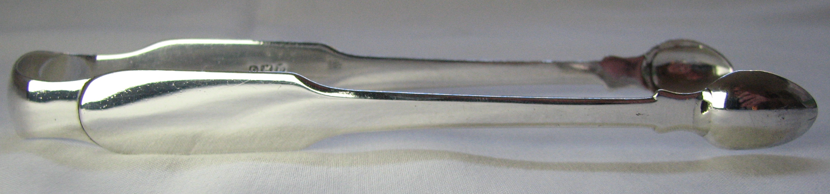 This pair of tongs is unusually large, being 6 inches long and weighing over 50 grams. They are also unusual in style being of a fiddle pattern but with a curved top part. They also have a lovely monogram "II".