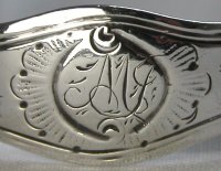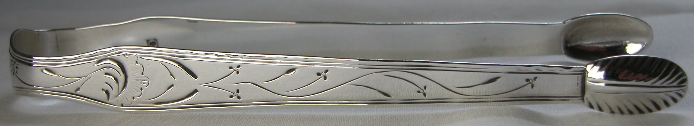 These are a pair of bright cut engraved tongs with a delightful stylised engraved flower pattern, (Adam style), and oval bowls with a deep engraved leaf pattern style engraving. The monogram is very carefully made as an integral part of the overall design. Click on any picture to enlarge |