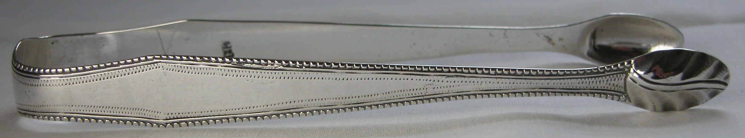 These are a pair of bright cut engraved tongs. They have a thread and beaded edge and an unusual light prick dot pattern engraved all around they arms. They have oval bowls with a deep engraved leaf pattern style engraving. Click on any picture to enlarge |