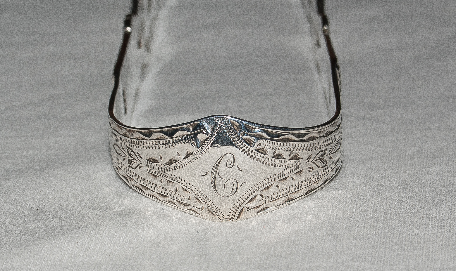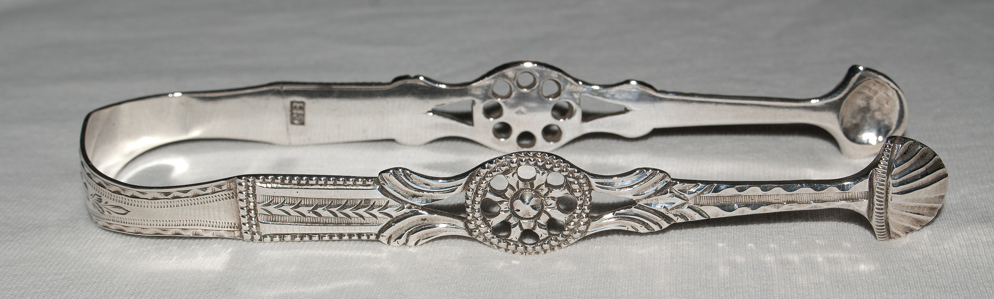 These are a lovely pair of cast tongs with a circular centre-piece in the arms. These tongs are in pristine condition and a beautiful example of the quality of work carried out by 18th century silver-smiths.