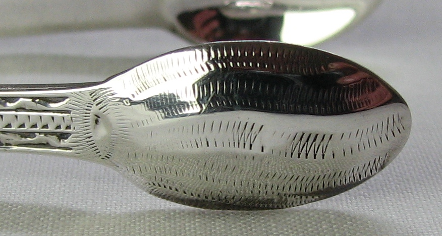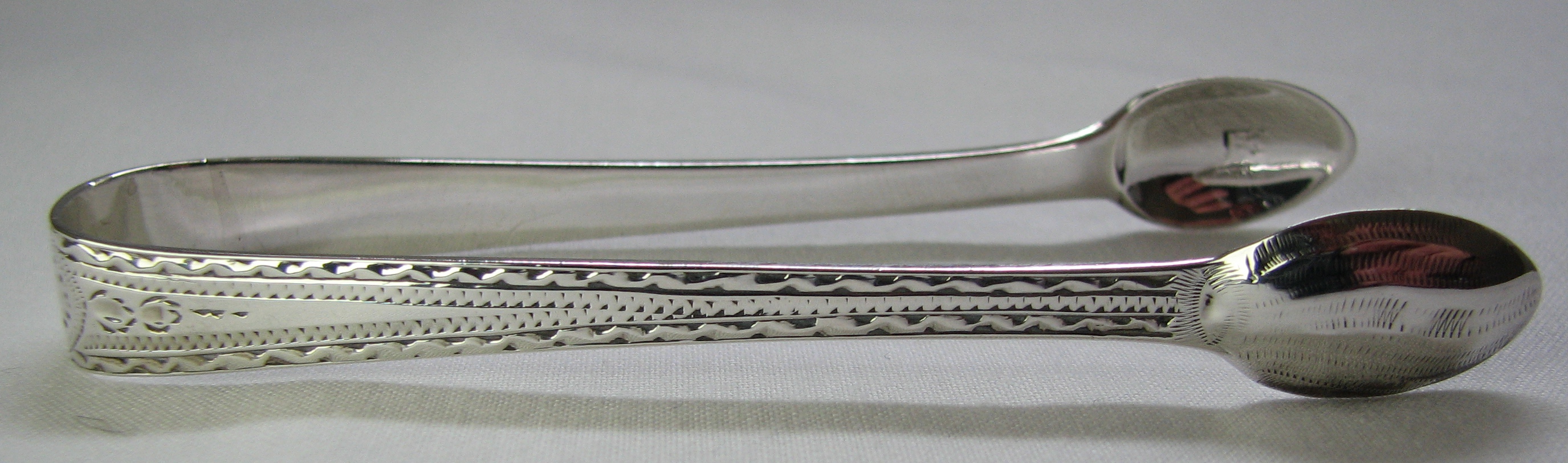 These are a pair of miniature tongs, just 3.¾ inches (93cms) long. They are in superb condition, bright cut engraved and fully hallmarked in the bowls. There is no sign of any repair which would mean that these tongs were made this size. They are dated between 1786 & 1790. Click on any picture to enlarge |