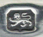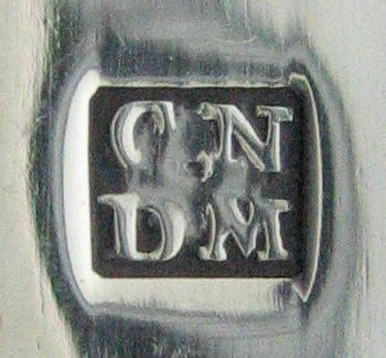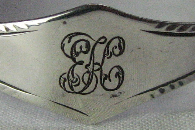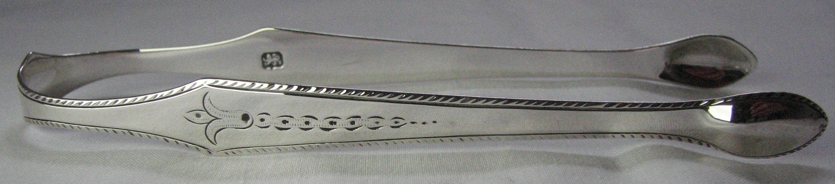 These are a lovely pair of flared, bright cut tongs. This pair is very delicately made, with a narrow wasted shoulder and "feather" edge. Notice the maker's mark has a pellet between the letters.
