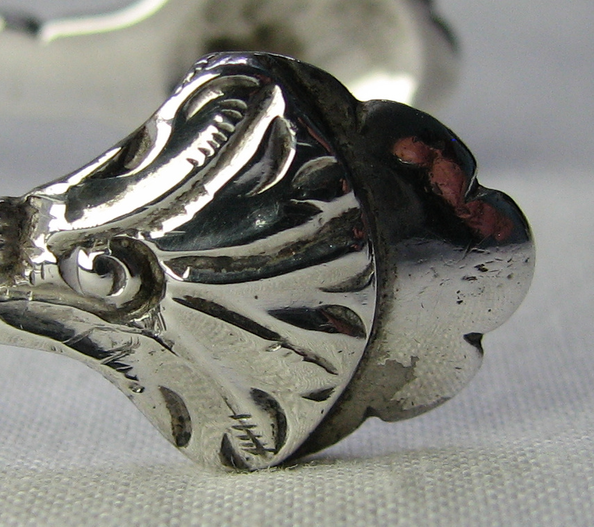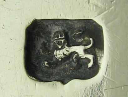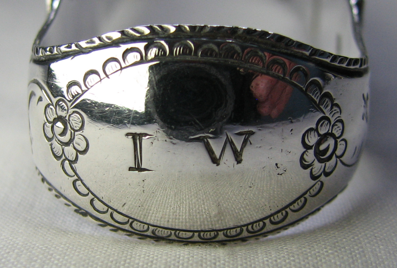 This is a pair of cast tongs. Unfortunately they have a strengthener to one arm and a solder repair to the other. This is not unusal for cast tongs as they rarely come through 250 years of history without some damage. If you look closely at the maker's mark it appears to have been overstruck. This is not an unusual occurence and would indicate that he did not make them himself. I have estimated the date of these tongs at around 1770 to 1775. Click on any picture to enlarge |