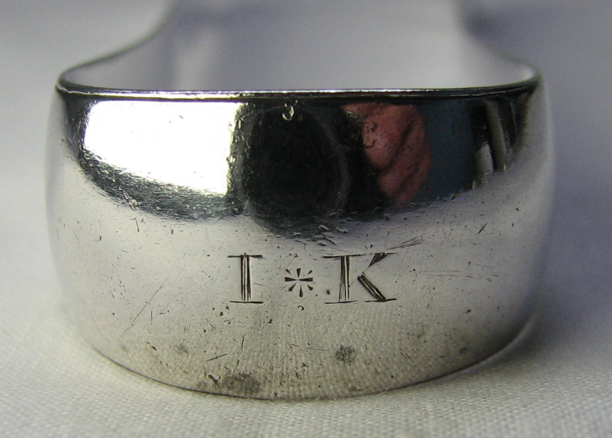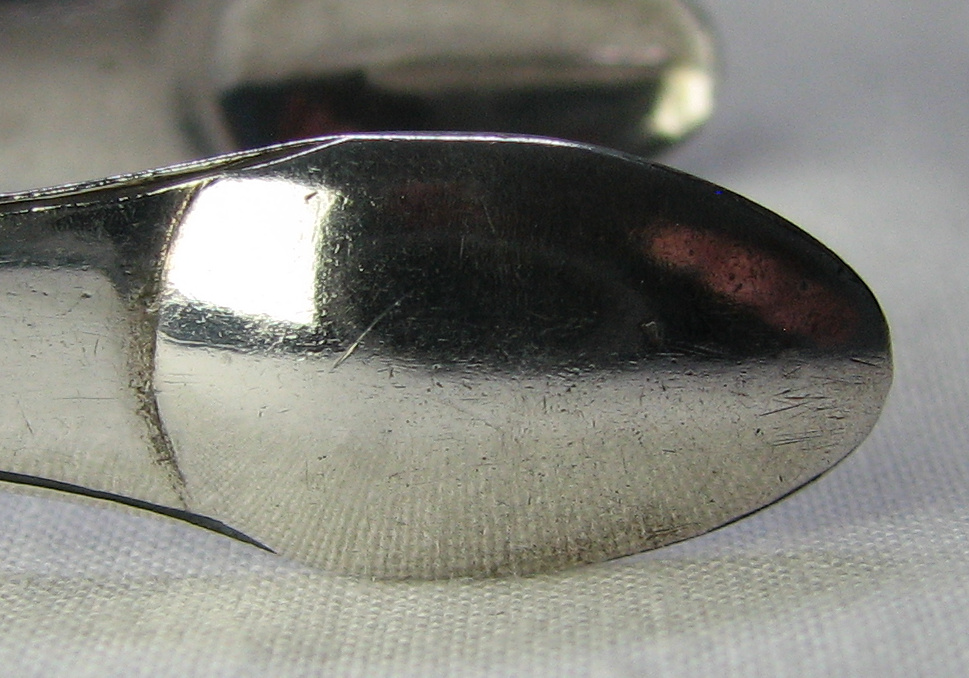 This is a pair of very ordinary "Old English" style tongs. The only slightly unusual feature is that the arms are a tiny bit wider than normal where they join the bowls. The maker's mark has not been overstruck on these tongs. I have estimated the date of these tongs at around 1780 to 1784. Click on any picture to enlarge |